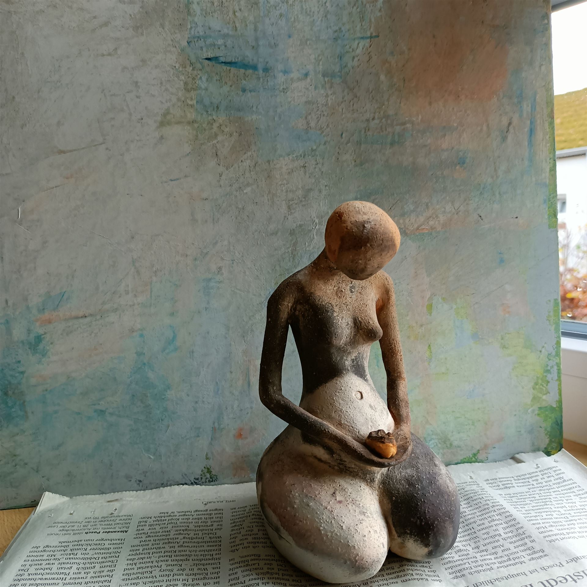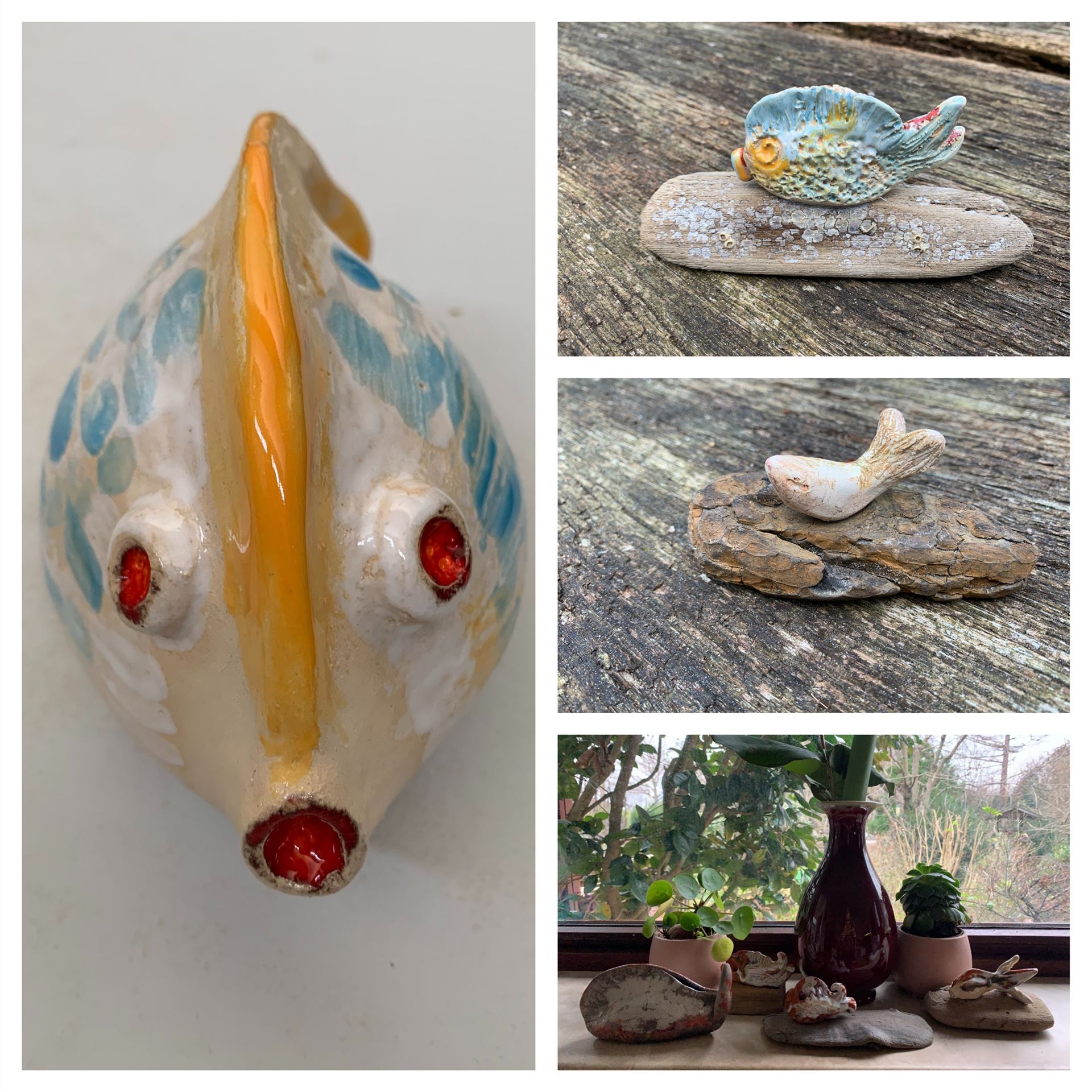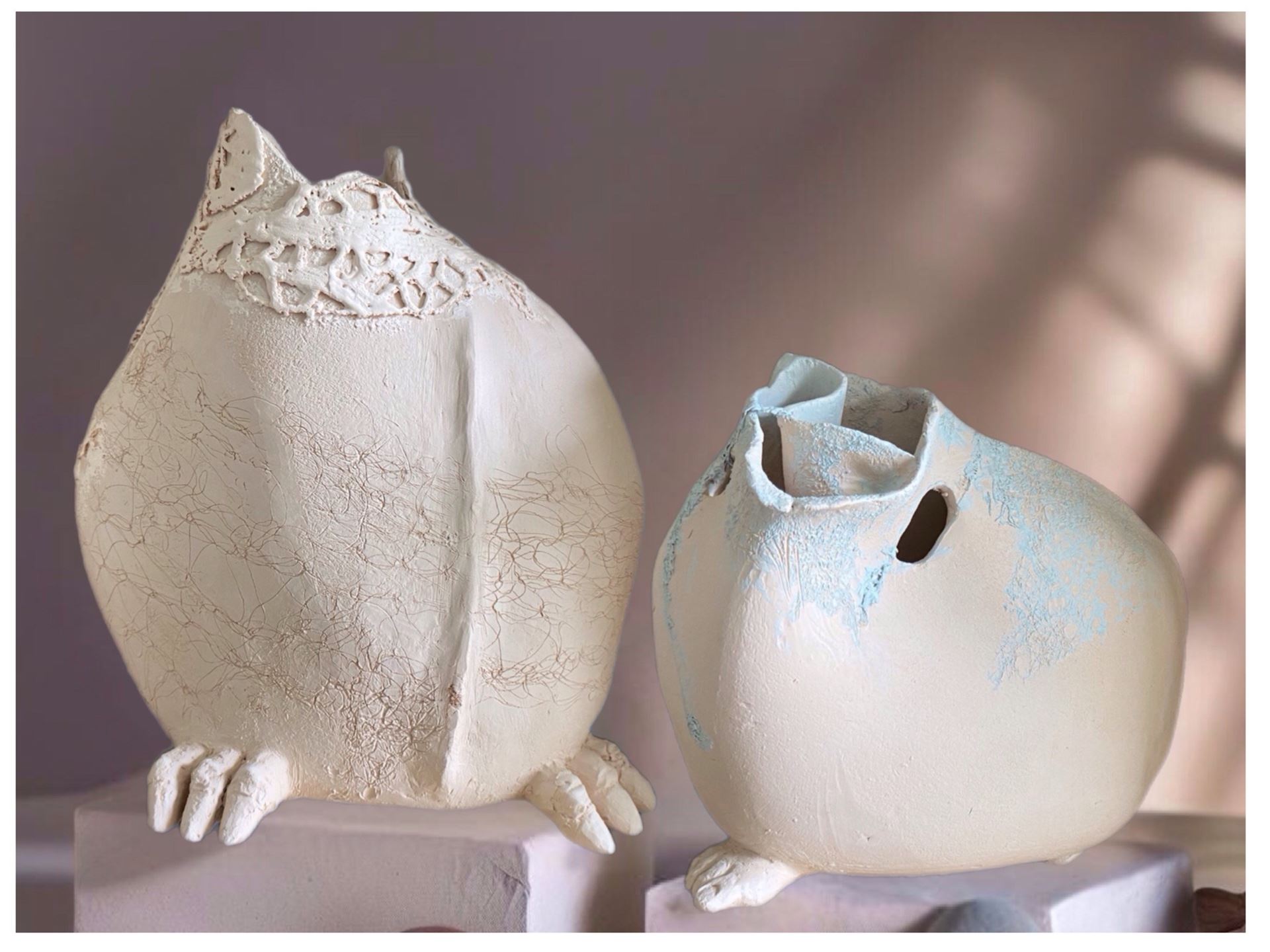 Wir experimentieren mit verschiedenen Tonsorten, fett oder schamottiert, und setzen Oxyde und Glasuren ein, um unseren Werken eine besondere Optik zu geben.