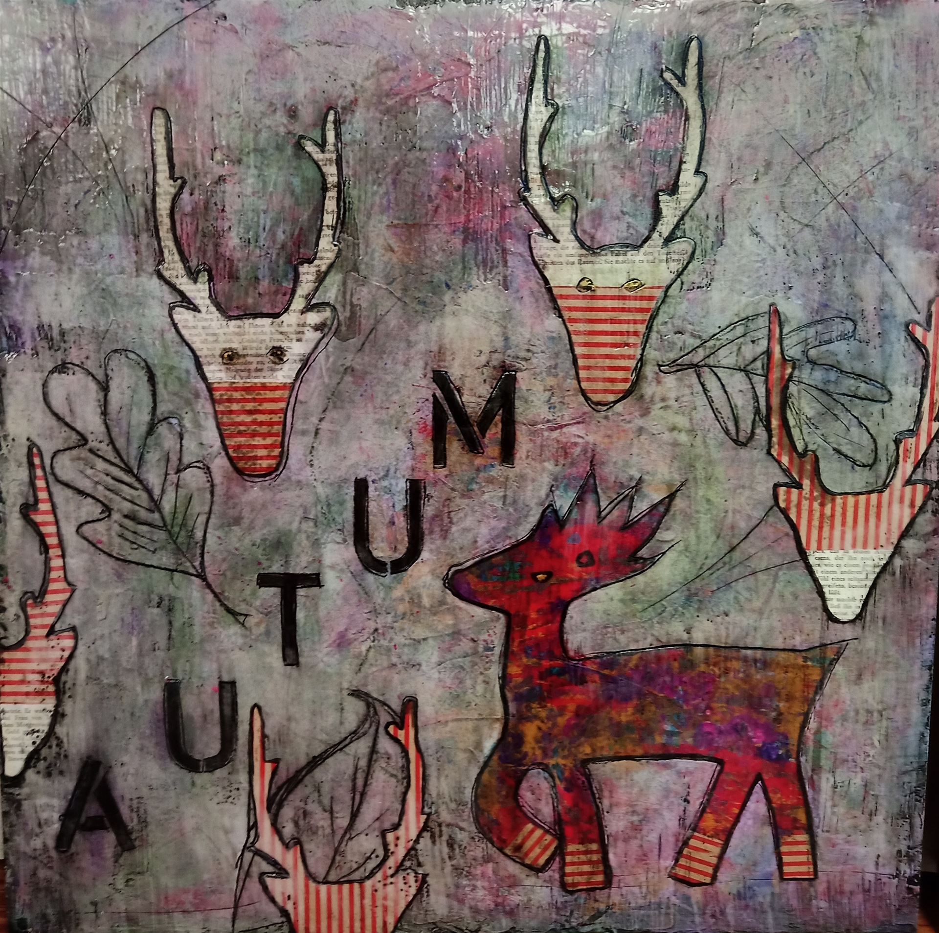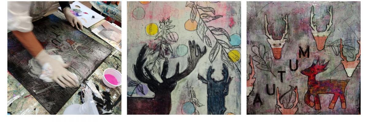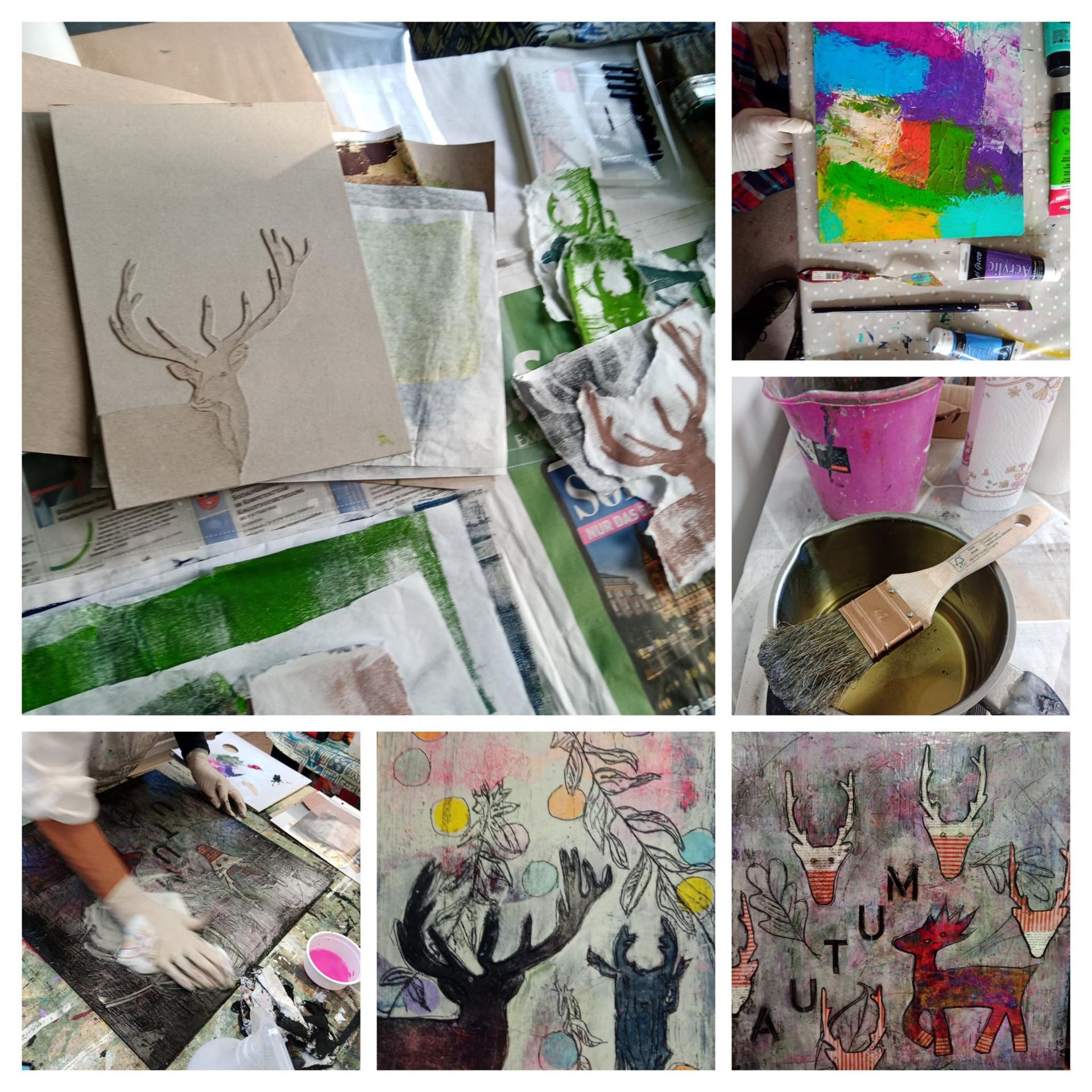... mit Struktur, Schwarz darüber und dann expressiv Acrylfarben mit allem, was die Farbpalette hergibt oder was gefällt bemalen. Dann ist die Voraussetzung geschaffen für alle weiteren Schritte, Flächen und Formen schaffen, zeichnen, collagieren zum Thema „Herbst und Hirsch“ und was einem sonst in den Sinn kommt.