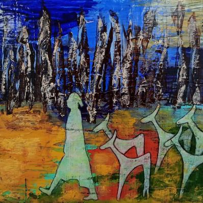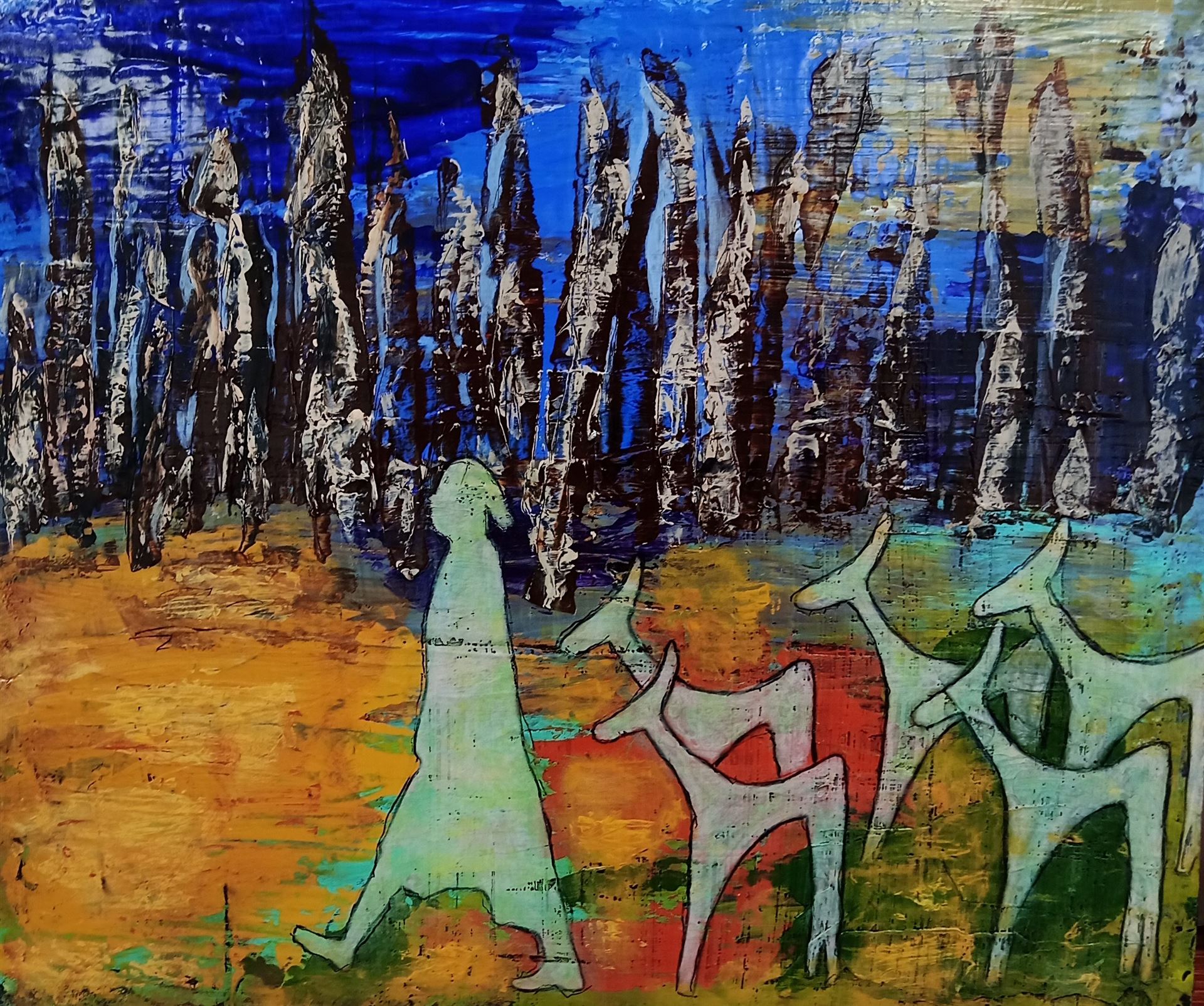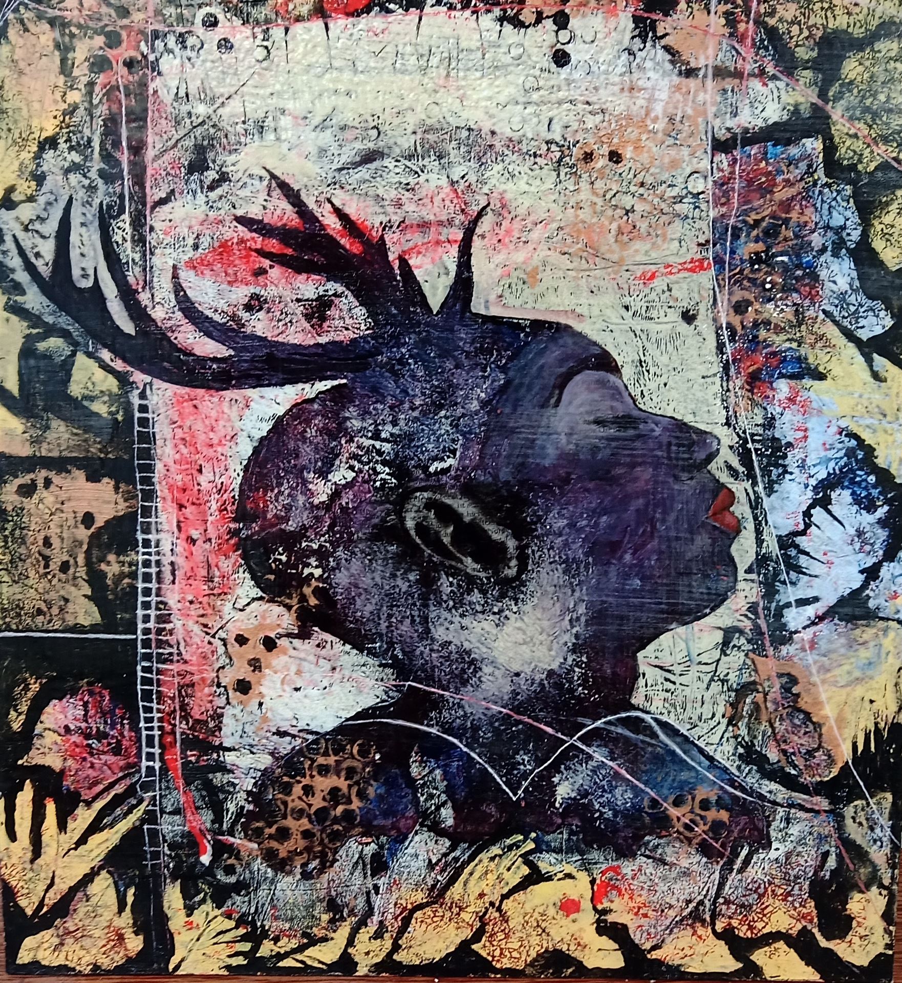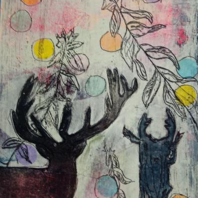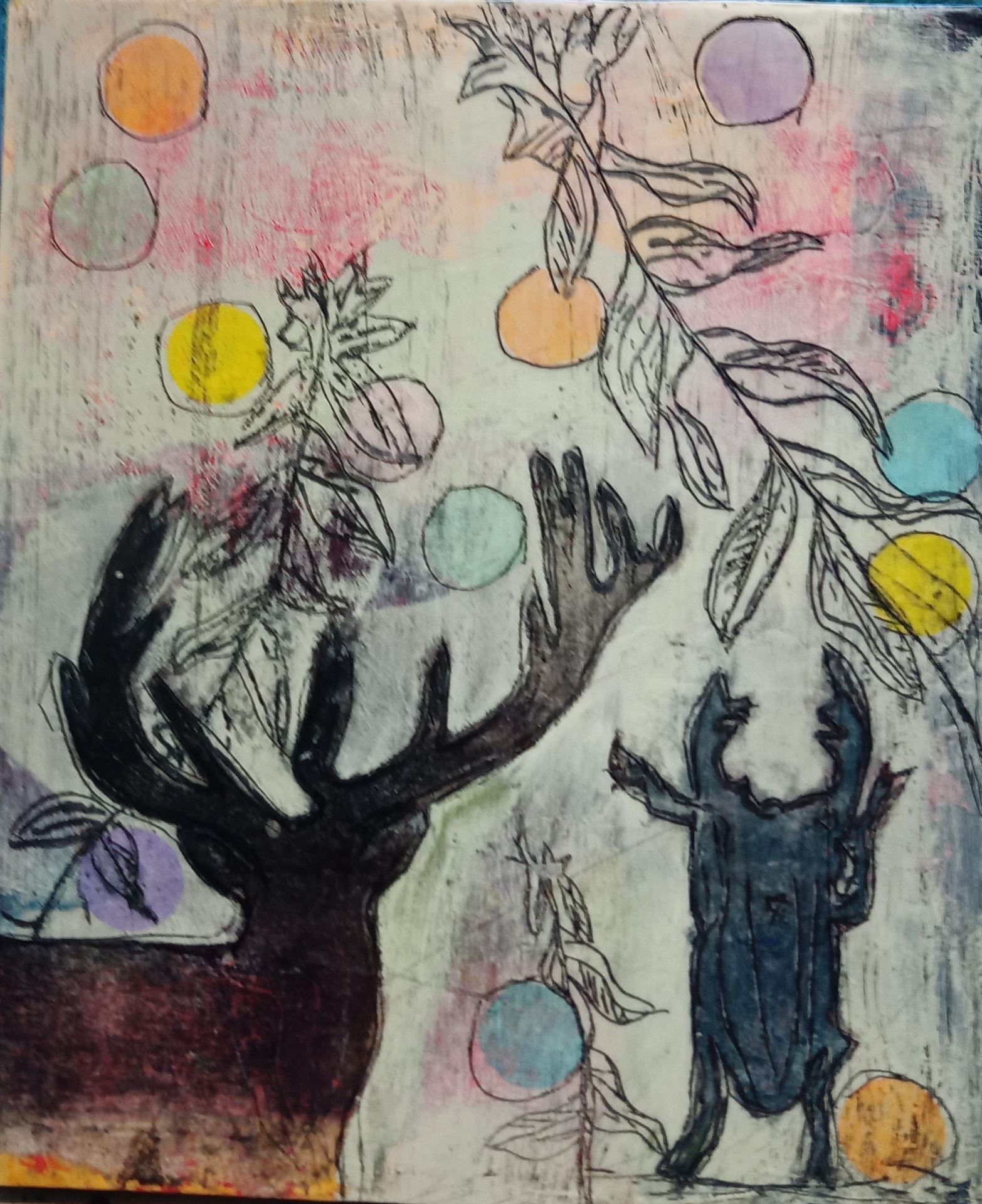 ... mit Struktur, Schwarz darüber und dann expressiv Acrylfarben mit allem, was die Farbpalette hergibt oder was gefällt bemalen. Dann ist die Voraussetzung geschaffen für alle weiteren Schritte, Flächen und Formen schaffen, zeichnen, collagieren zum Thema „Herbst und Hirsch“ und was einem sonst in den Sinn kommt.