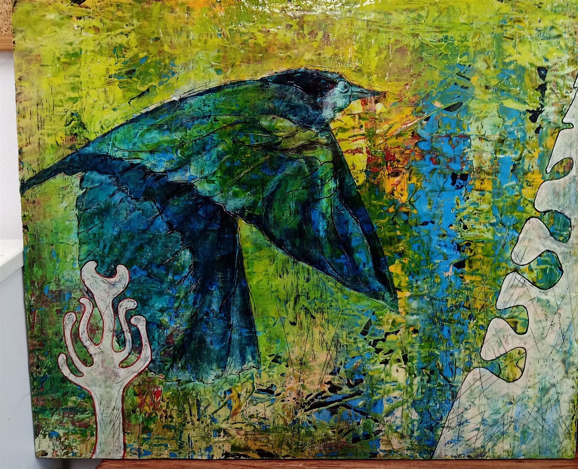 Es geht ums Schichten, Formen herausarbeiten, Verwerfen, neu erfinden, kurz ums Experimentieren. Bis die Malende mit einem zufriedenen Lächeln zum heißen Wachstopf geht und die Oberfläche mit dem Geschmolzenem überzieht. Jetzt nur Mut, mit spitzem Werkzeug darf die gewachste Fläche aufgerissen werden, dort wo später schwarze Linien im Bild erwünscht sind, sie werden im nächsten Schritt großzügig mit schwarzer Ölfarbe gefüllt.