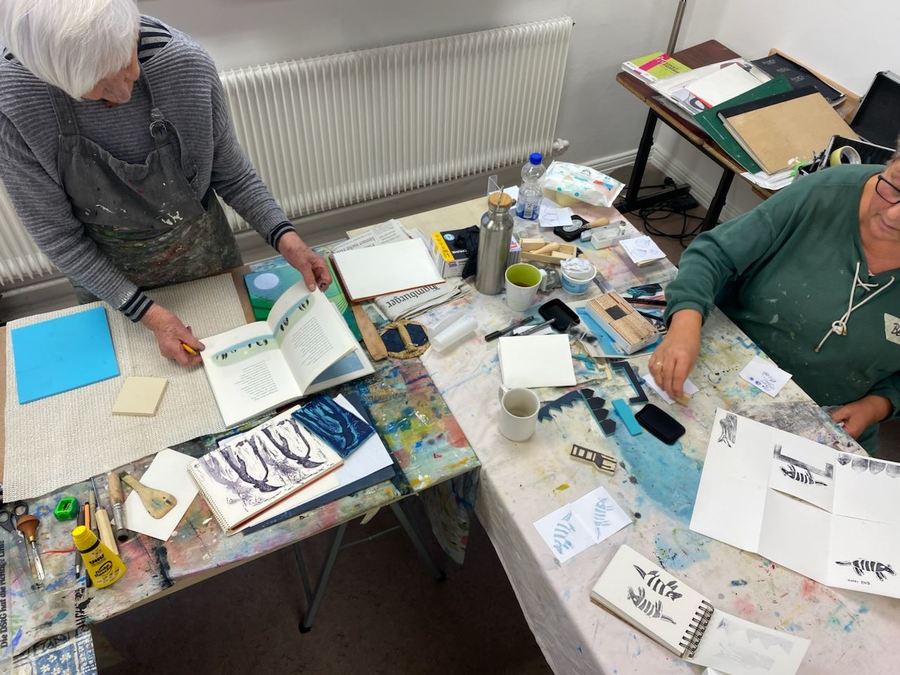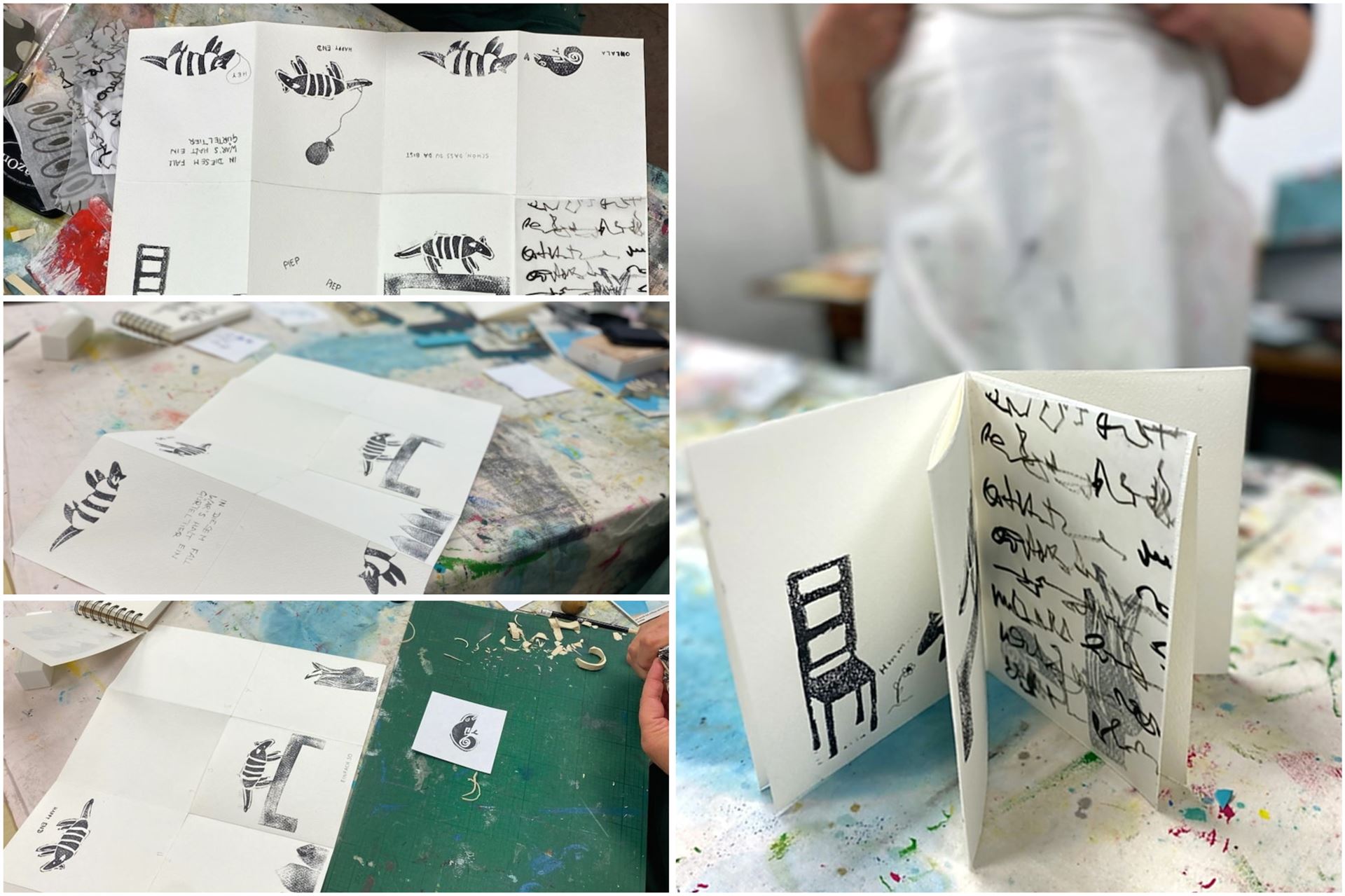 Eine Idee war, aus besonderer Falttechnik ein kleines Büchlein herzustellen, wo jede Teilnehmerin einen ihrer Stempel auf eine Seite druckte und am Ende acht Bücher entstanden sind.