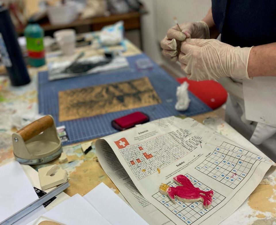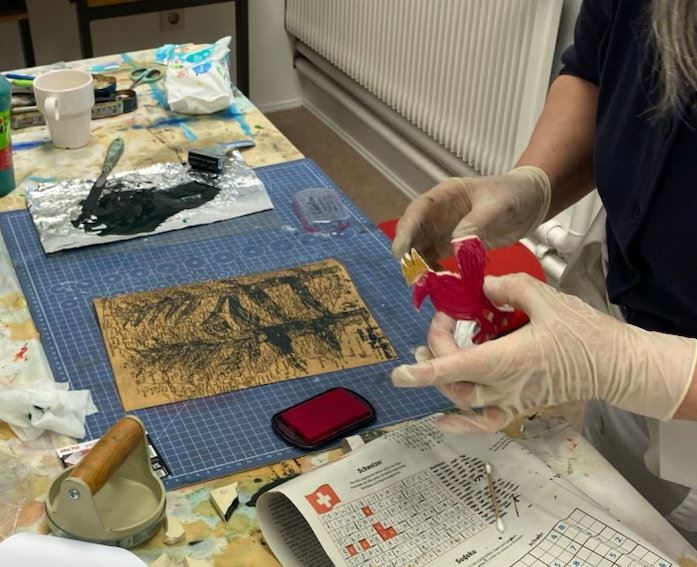 Nach der Schnitzarbeit ging es an die Farbe, und wichtig die Wahl der Untergründe wie vorhandene gesammelte Bilder, Alte Buchseiten, Briefumschläge, verschiedene Papiere ....
